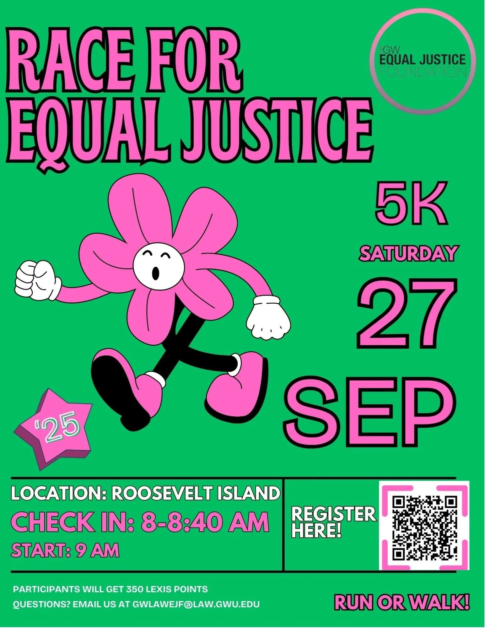 The 2025 Race for Equal Justice will be a 5k (3.1-mile) run at Roosevelt Island. Participants are welcome to take the course at their own pace: sprint, jog, or walk the course! After the 5k, there will be a raffle entry and food!